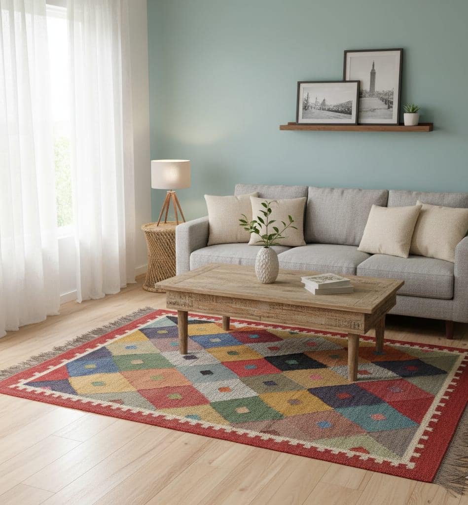 Our exquisite Wool Jute kilim rug, a stunning fusion of natural fibers and boho-inspired design, perfect for enhancing the ambiance of your living room. Crafted with great attention to detail, this rug embodies both beauty and functionality, adding a touch of rustic elegance to your space.